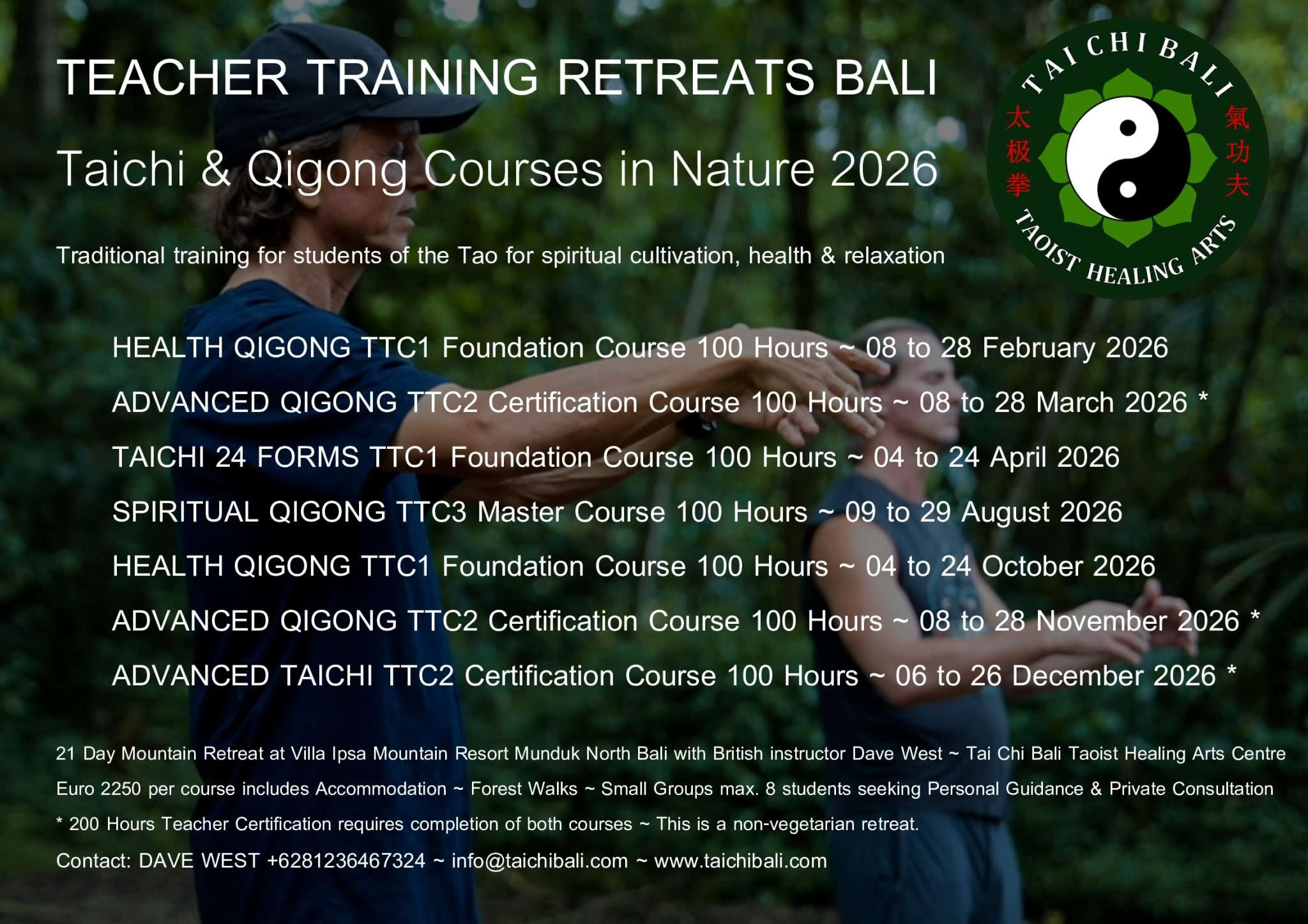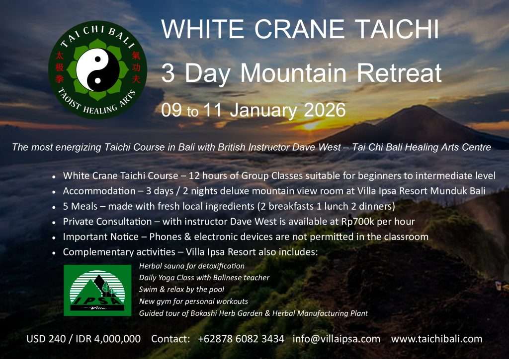With over 20 years teaching Yang Style Tai Chi Chuan and Taoist Qigong, and over 30 years of Sivananda Yoga, British instructor and long time resident in Bali Dave West offers personalized instruction for small groups in Nature, based on Tao philosophy for health and relaxation, moving meditation, breath regulation and energy circulation.