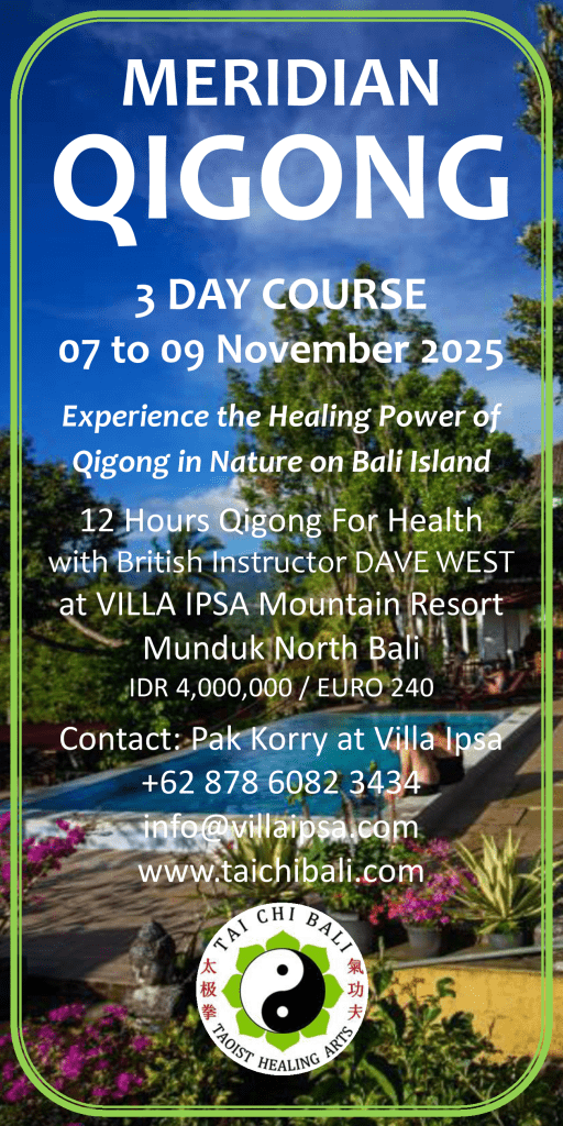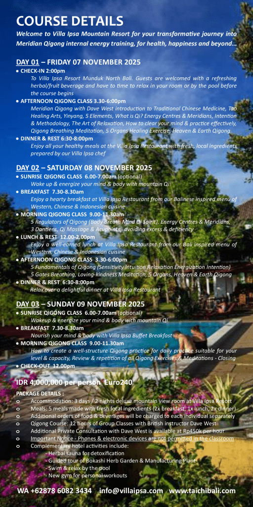 The Retreat is held near the secluded mountain village of Munduk at an altitude of 1000m, deep in the bamboo rain forests of North Bali. At selected natural beauty spots along the way you can practice Tai Chi and Qi Gong and absorb the abundant Qi of nature with relaxing stretches, breathing exercises, and energy meditation. Google Map