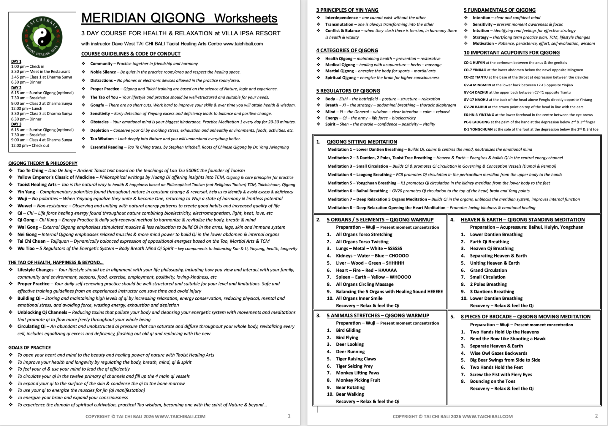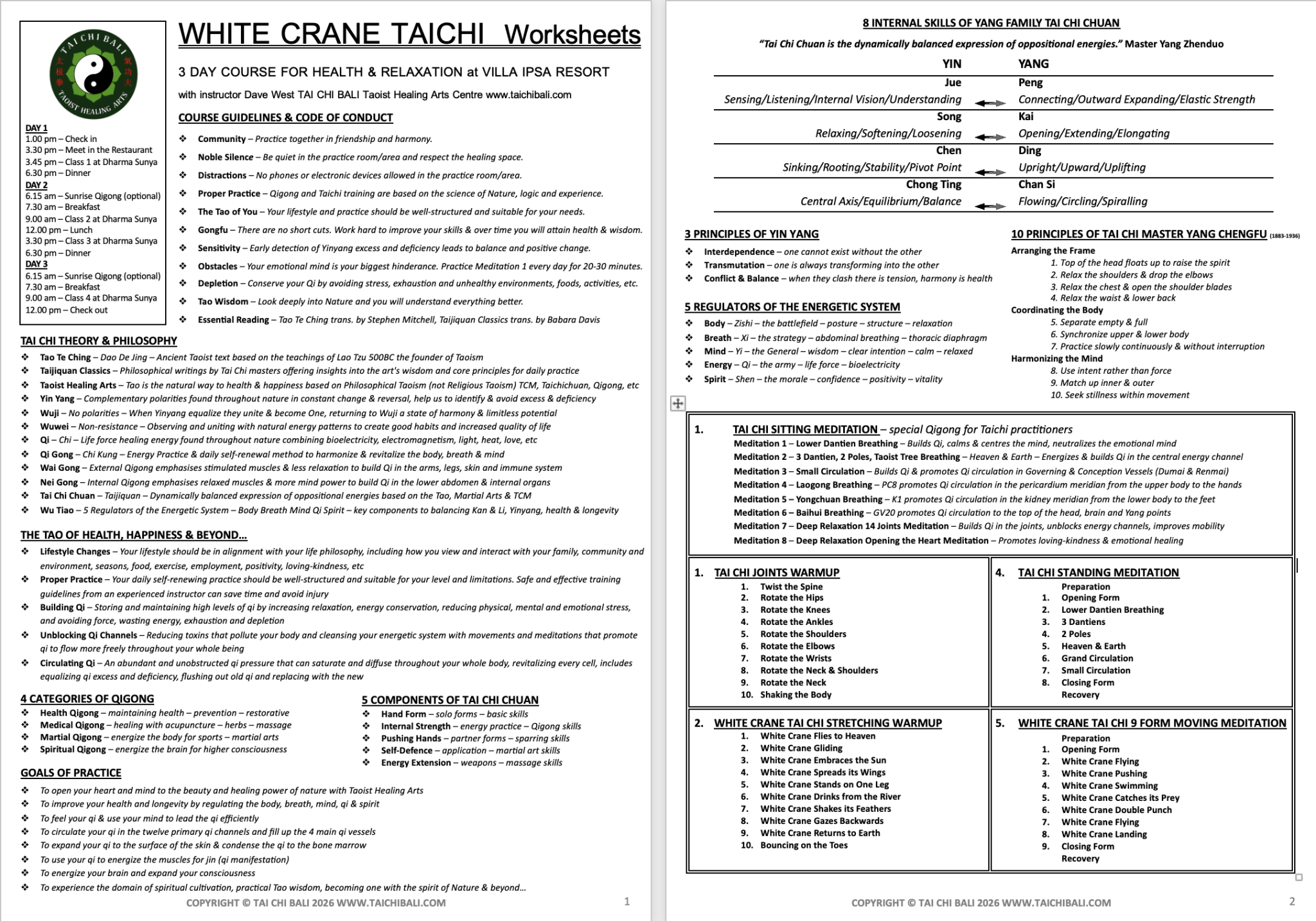 Tai Chi and Qi Gong have their roots in Tao philosophy and includes: Introduction to Taoist Healing Arts, Qi Gong Breathing Meditation, Meridian Qi Gong, Energy Meditation, White Crane Tai Chi, Qi Gong 8 Brocades, Qi Gong 5 Animals, Qi Gong 6 Healing Sounds, Forest Qi Gong, Forest Therapy, Tai Chi Walking Meditation, 4 Core Movements of Tai Chi, Yang Style Tai Chi 24 Forms and Tai Chi Pushing Hands. Theory includes 3 Principles of Yin and Yang, 5 Fundamentals of Qi Gong, 5 Regulators of the Energetic System and 10 Principles of Tai Chi Chuan. PDFs & Videos are included in the Retreat Price to support topics taught in class, and includes advanced philosophy and theory for further study at home.