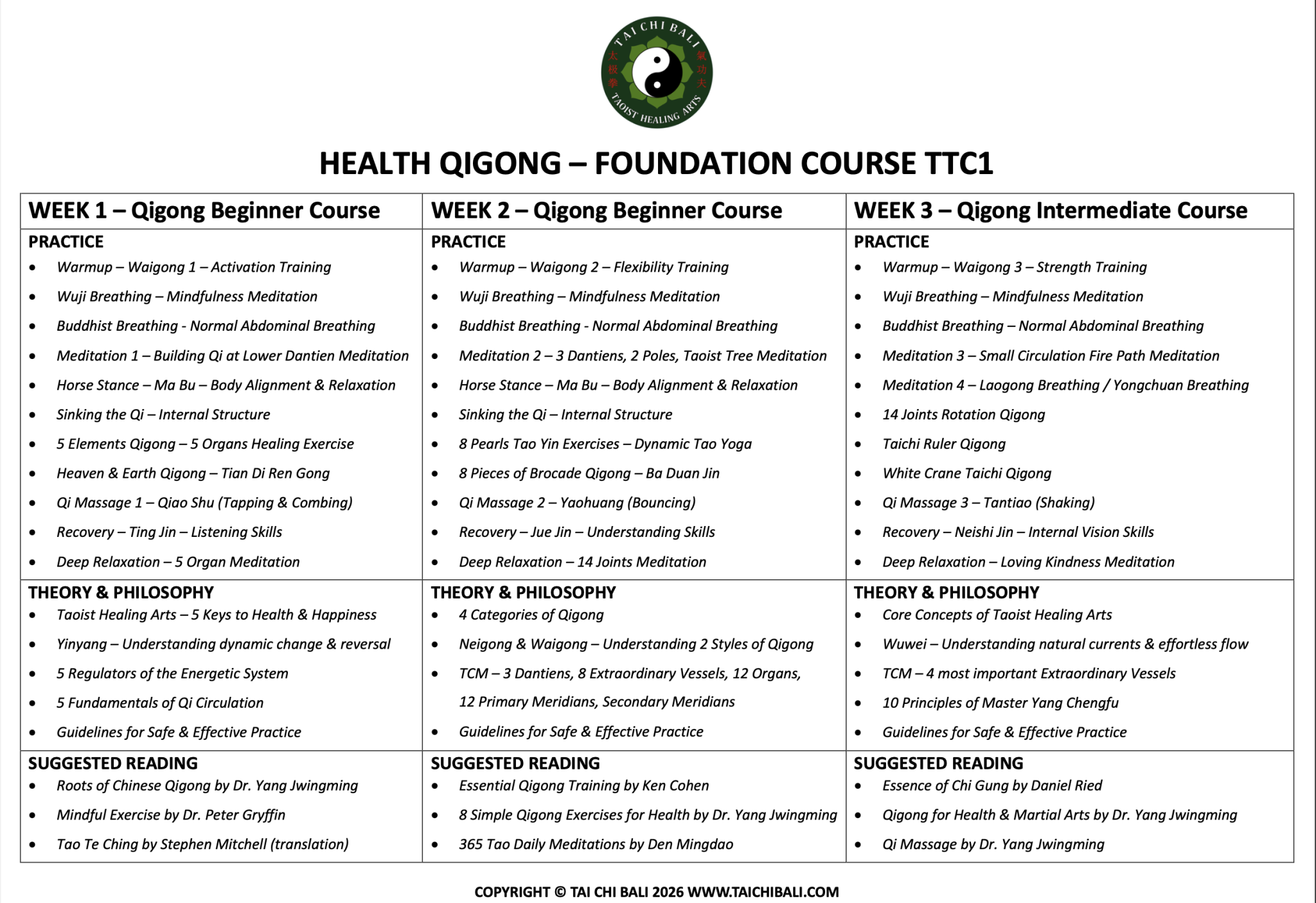 TTC1 FOUNDATION COURSE is for beginner and intermediate students interested in the fundamentals of Taoist Healing Arts, Taichi and Qigong. Everyone can join this course even if you’re not interested becoming a teacher.