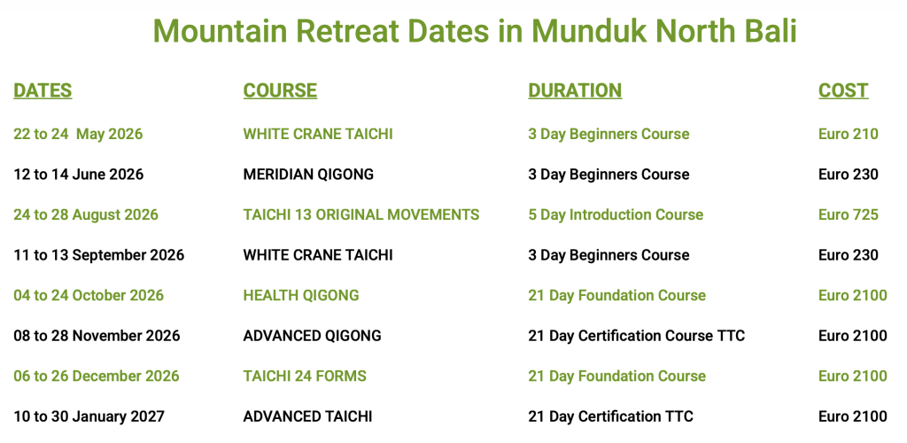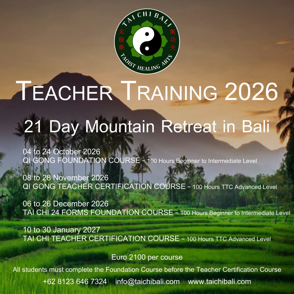 Teaching Taichi & Qigong is a great way to help make a difference in other people’s lives while keeping yourself healthy & relaxed. Our 21 Day Mountain Retreats take place in Munduk North Bali and are designed for small groups max.8 students. We offer Teacher Training Courses in two parts; TTC1 Foundation Course & TTC2 Certification Course. Full certification requires completion of both TTC1 & TTC2.